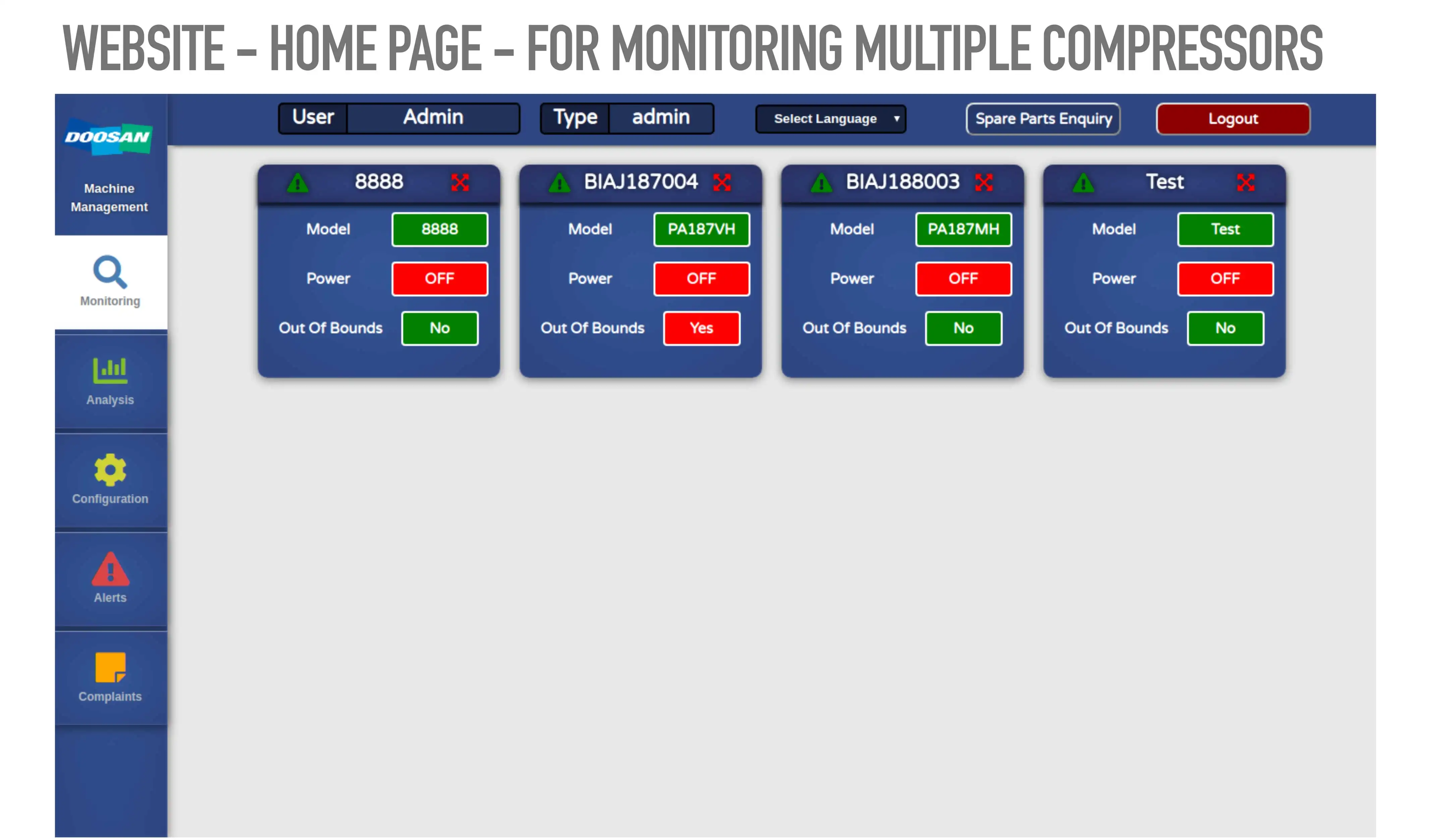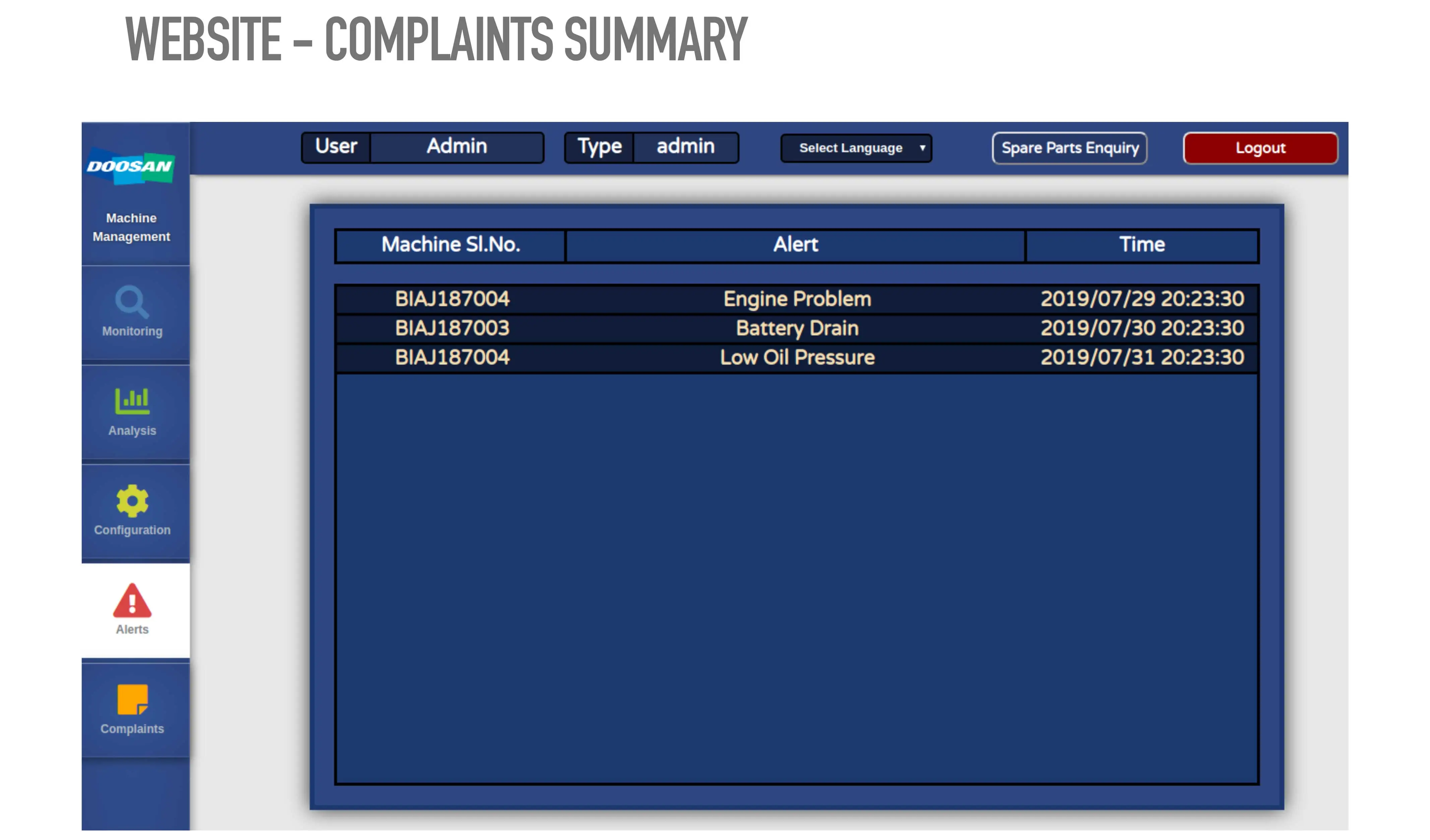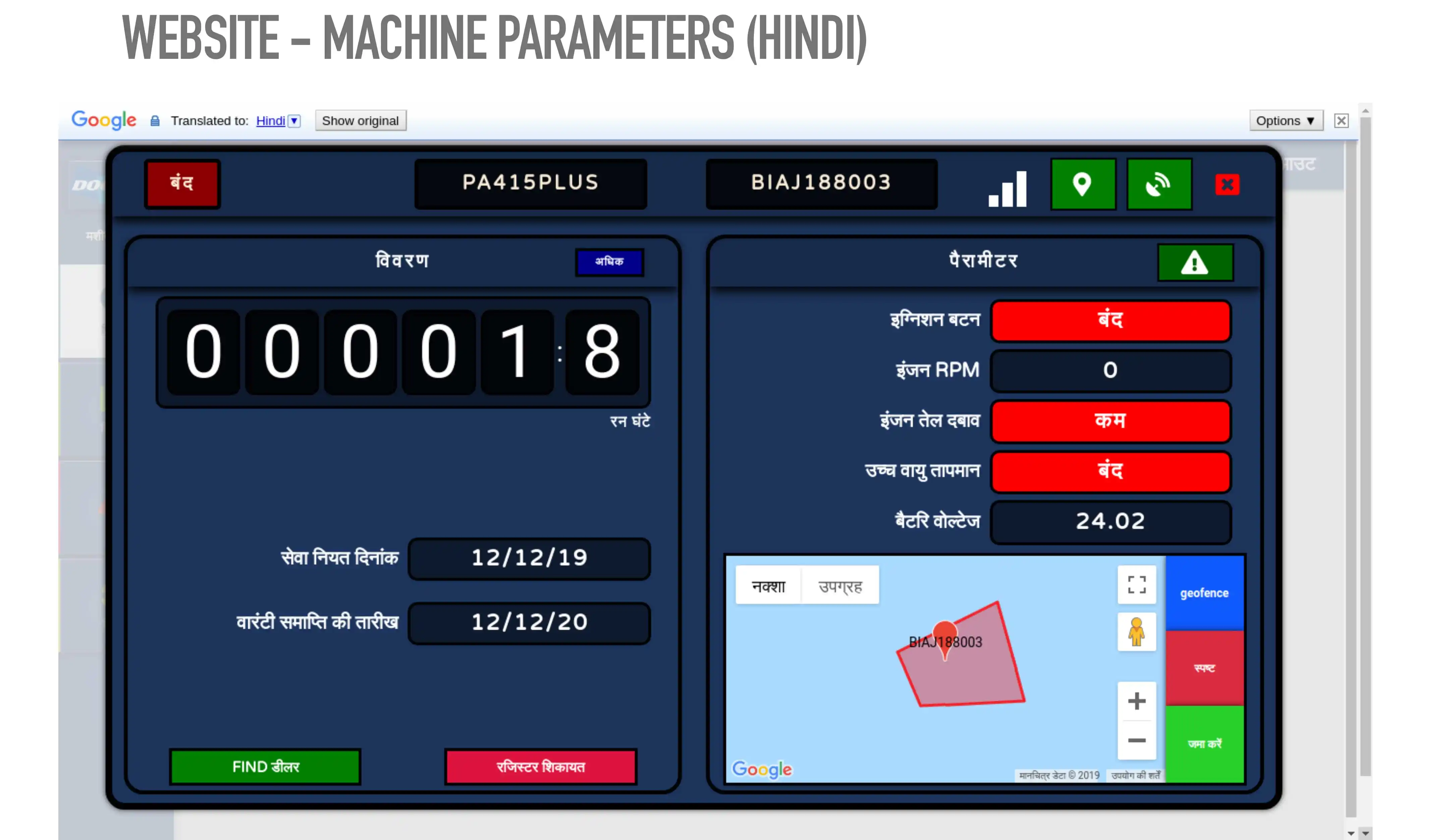 The cloud dashboard provides structured, role-based access for owners, dealers, service technicians, and administrators. Available in English, Hindi, and Tamil, the interface displays live machine status, validated run-hours calculated using ignition and RPM logic, service and warranty reminders, and automated alerts delivered through SMS and email. Historical data visualization supports long-term performance analysis and predictive maintenance planning.